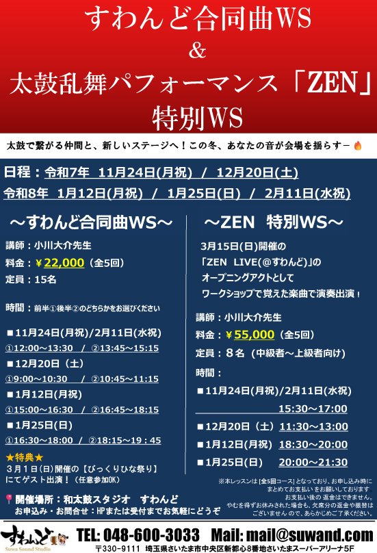 【特別WS】すわんど合同曲& 和太鼓「ZEN」特別WS 開催情報!